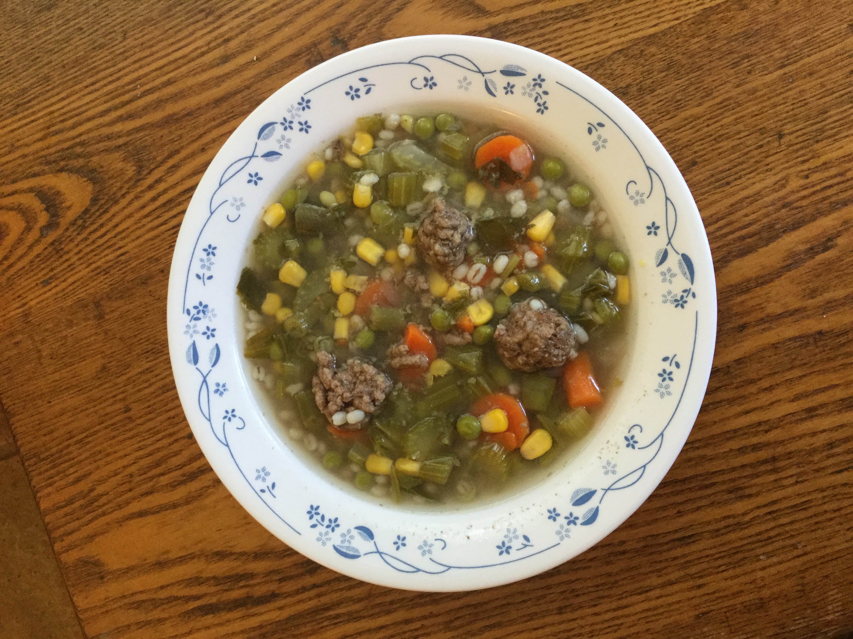Roll tiny meatballs from approx 1/2-1/3 lb 97% ground beef & drop into boiling broth