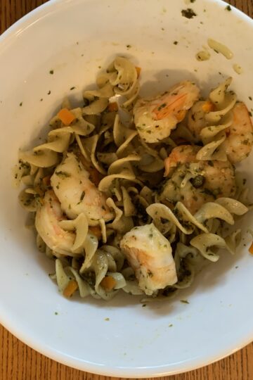Serves 3 8 ounces orzo pasta or noodles 2 T pesto 2 T extra-virgin olive oil, divide 2 c thawed raw shrimp 1/2 c diced red, yellow or green bell pepper 1 t capers 1/4 t dried oregano 1/4 t garlic powder 1/4 teaspoon red pepper flakes (optional) S & P to taste 1/4 c […]