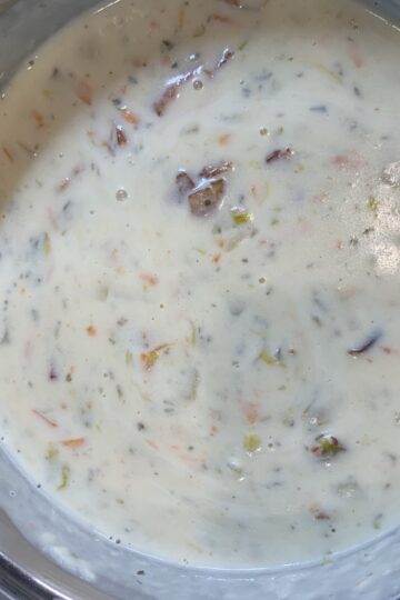 1/2 cup mayonnaise 1/2 cup sour cream 1/3 cup milk 1/2 teaspoon Worcestershire sauce 3 teaspoons white wine vinegar 1/4 teaspoon garlic 1/2 teaspoon freshly cracked black pepper 1/4 teaspoon salt or to taste 5 oz blue cheese or Gorgonzola Mix together refrigerate about 2 hrs before serving