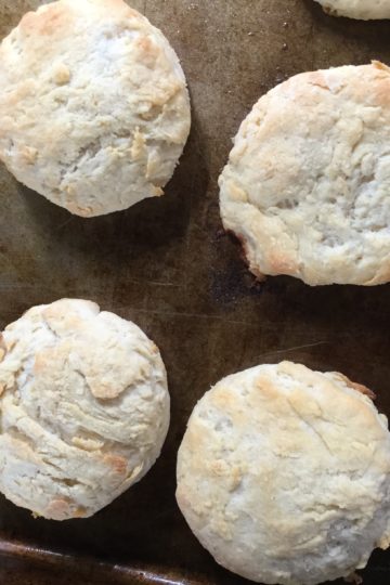 2 c self rising flour 1 stick cubed, cold butter 3/4 c buttermilk or 3/4 reg milk w 2 t white vinegar Mix flour & butter until crumbly, add milk, mix again Turn on boarded board & knead for a few minutes until it holds together, roll to about 3/4 “ thick & brush tops […]