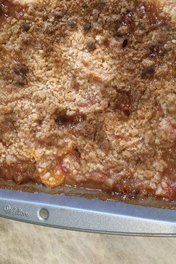 1 c flour 1/3 c packed brown sugar 1/4 t cinnamon 1/4 t salt 1 stick of cold butter, grated Mix all together & spread on top of any fruit that’s going to be baked