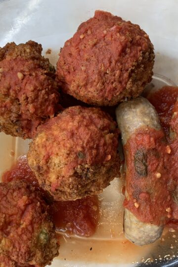 Risotto 3 T evoo 2 c Arborio rice 30 oz chicken stock Heat rice in evoo & stir quickly fur 2 min Add chicken stock until absorbed, stirring continuously until al dente Set aside to cool, then add an egg & refrigerate for a few hours or overnight To Make Arancini Place some rice in […]