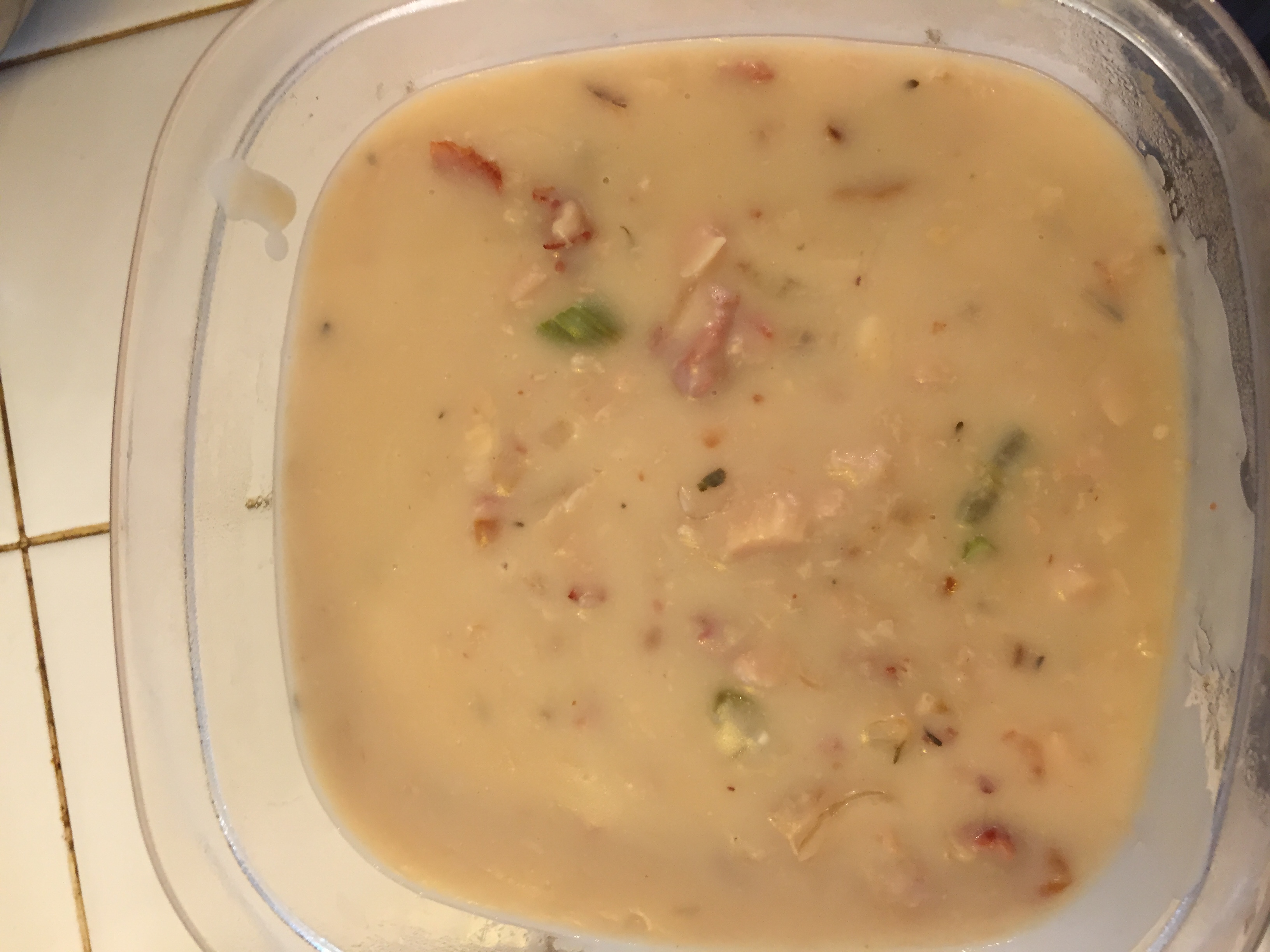 When browned add 2 stalks chopped celery, 1/2 chopped small onion, 2 minced garlic cloves, 2-3 bay leaves , 1 med, peeled diced potato, a sprinkle of thyme & 3 cans of Snow’s minced or chopped clams, do not drain
