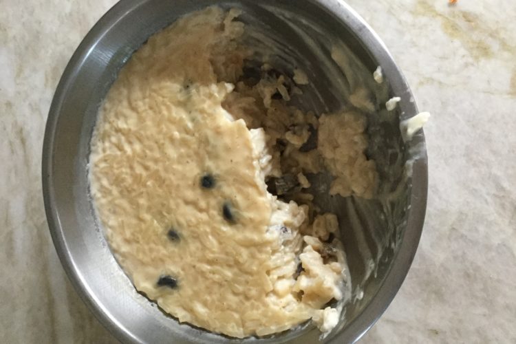 In a saucepan, combine 1 1/2 cups cooked rice, 2 cups milk, 1/3 c sugar, 1 beaten egg, 1/2 c raisins
