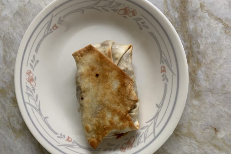 • One at a time, place egg roll wrapper on a clean surface, points facing top and bottom like a diamond. Spoon a 1/3 cup mixture onto the bottom third of the wrapper.